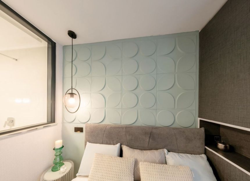 Inspirujte se ložnicí, kde se za postelí nachází 3D dekorační panely. Panely jsou přetřené mátovou barvou. Je to něco jiného a určitě se s panely interiér vyzdvihne o level výše. Interiér zrealizovala designérka Hedvika Novotná. Na našem e-shopu dekorační panel prodáváme s 80% slevou