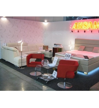 Ukázka realizace vliesové tapety na zeď Grandeco LU-07–05–6 na mezinárodním veletrhu nábytku a interiérového designu Mobitex Brno.
