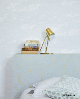 Světle modrá malba oblohy se zlatými ptáčky na bílém podkladu - vliesová tapeta.