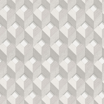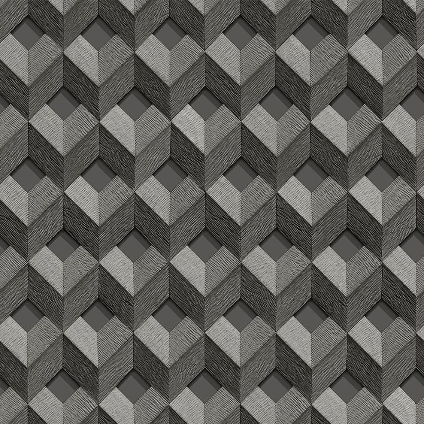 3D geometrický vzor na vliesové tapetě s vinylovým povrchem. Vzor je tvořený žíhanou texturou, tapeta má jemný pololesk - odstíny šedé, stříbrné, antracit.