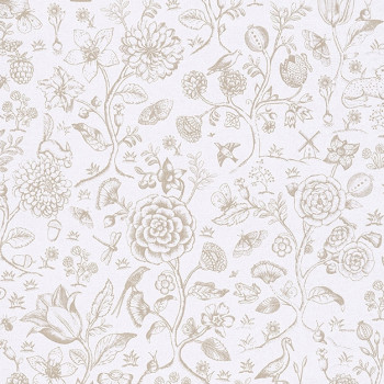 Vliesová tapeta s přírodními motivy - květiny, motýli, zvířecí motivy ve světlých šedo-béžových tónech.