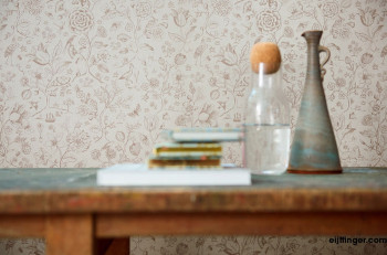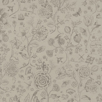 Vliesová tapeta s přírodními motivy - květiny, motýli, zvířecí motivy v šedo-hnědých tónech.