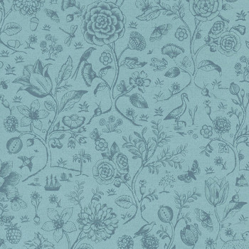 Vliesová tapeta s přírodními motivy - květiny, motýli, zvířecí motivy v jemných modrých tónech.