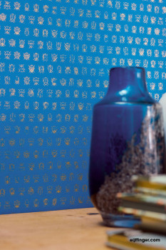 Pravidelný vzor se zlatými broučky na blankytně modré vliesové tapetě na zeď.