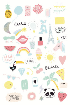 Bláznivě veselý motiv v tyrkysové a růžové barvě - kdo říkal, že na jedné tapetě nemůže být jednorožec, zmrzlina, meloun, Eiffelova věž, srdce a spousta dalších hezkých věcí....