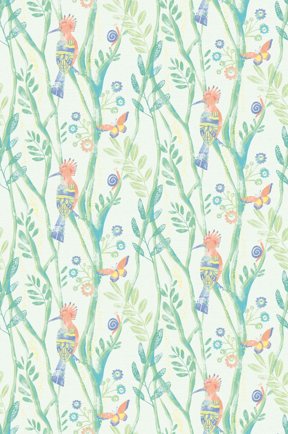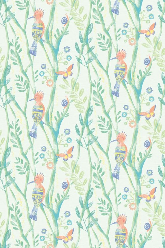 Dudek chocholatý a motýlci na tapetě s rostlinnými motivy.