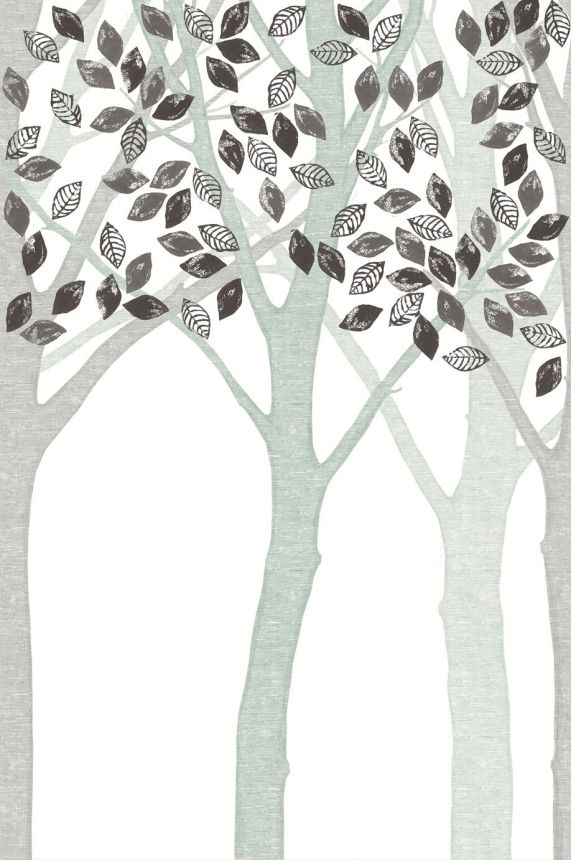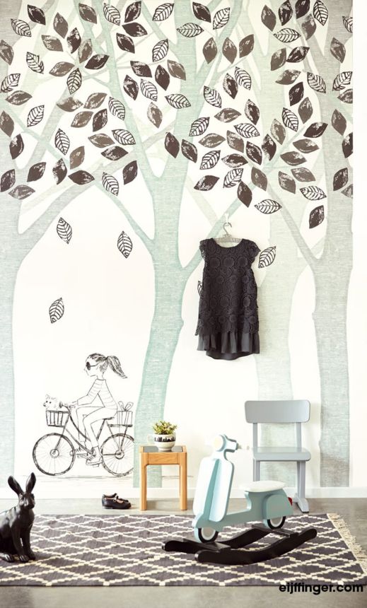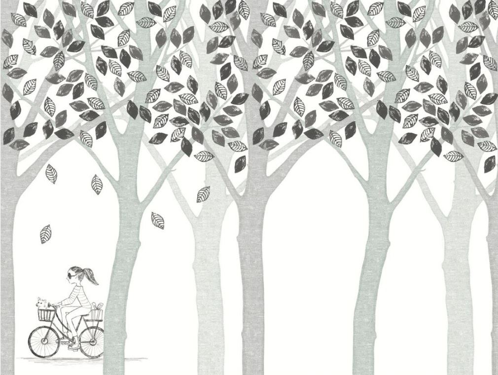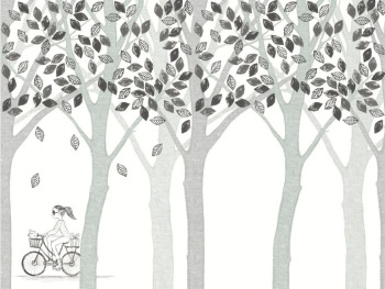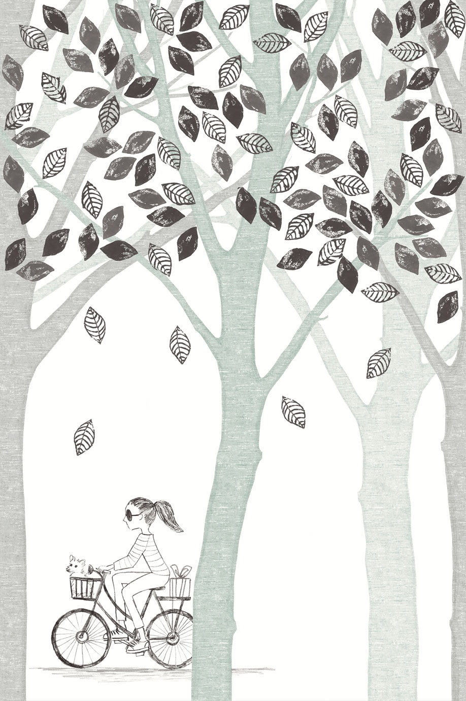 Jemné kmeny stromů v šedo-modrých odstínech s lístky a jednou malou cyklistkou se psíkem v košíku.
