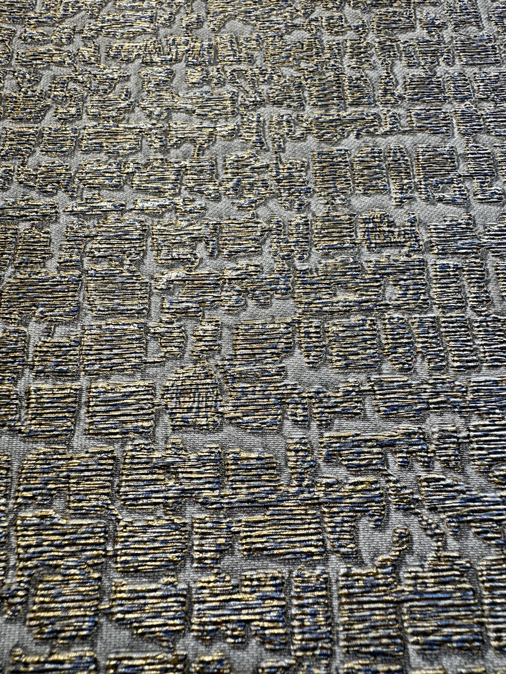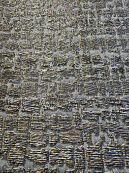 Moderní, efektní vliesová tapeta s netradičnín designem - podklad jemná šedo-hnědá pololesklá textilie, textura tapety tvořená modrými a zlatými metalickými "vlákny " .