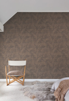 Přírodní a rostlinné motivy zpříjemní a zútulní každý interier. Strukturovaná proužková vliesová tapeta v šedo-stříbrných a bronzových odstínech s jemným vzorem palmových listů.