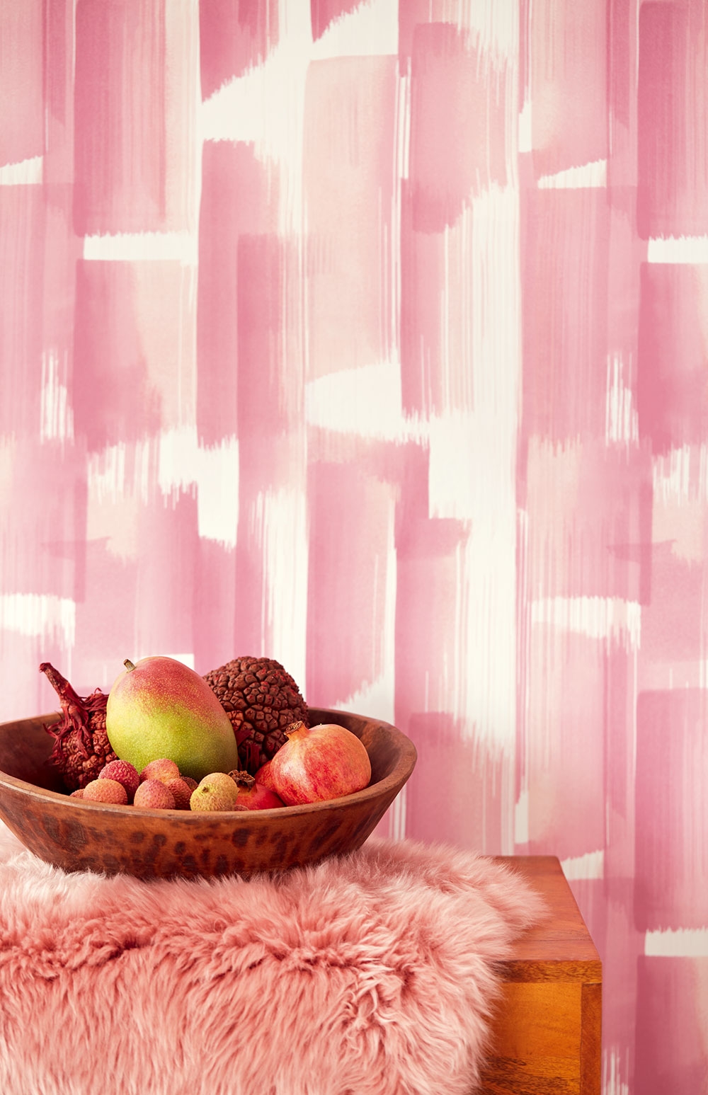 Růžové a lila tahy štětcem na vliesové tapetě na zeď. Efekty lesk/mat.
