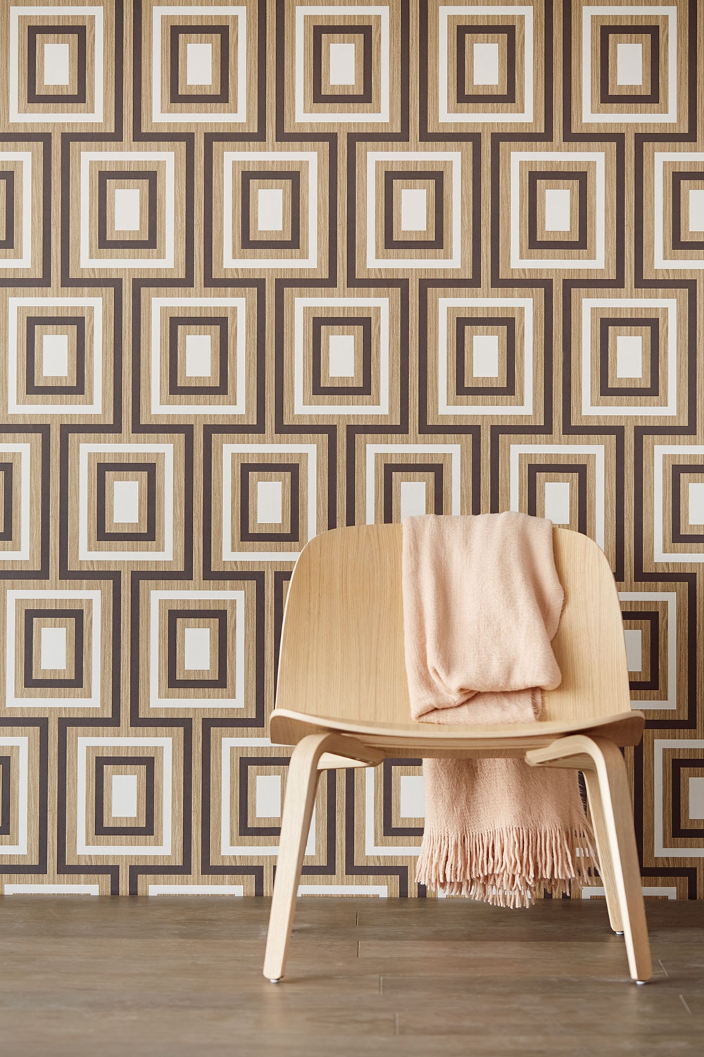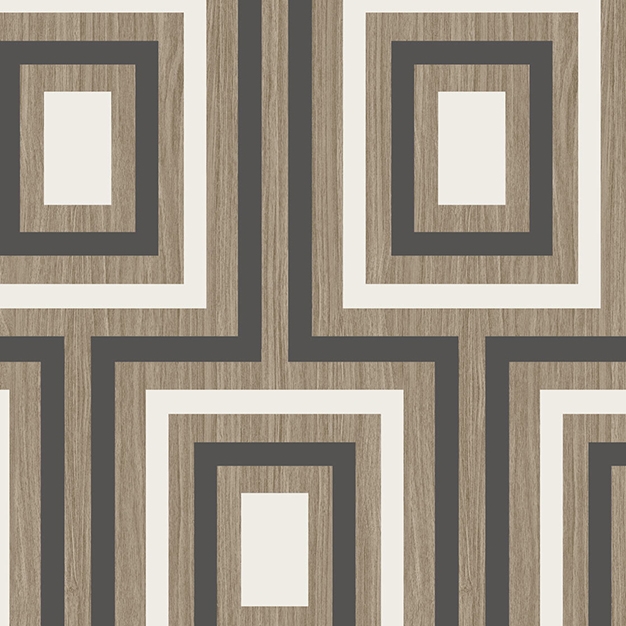 Geometrické vzory dodají vašemu interiéru moderní a dynamický vzhled. Šedo-černý a bílý geometrický vzor na žíhaném hnědém podkladu ( struktura dřeva ).