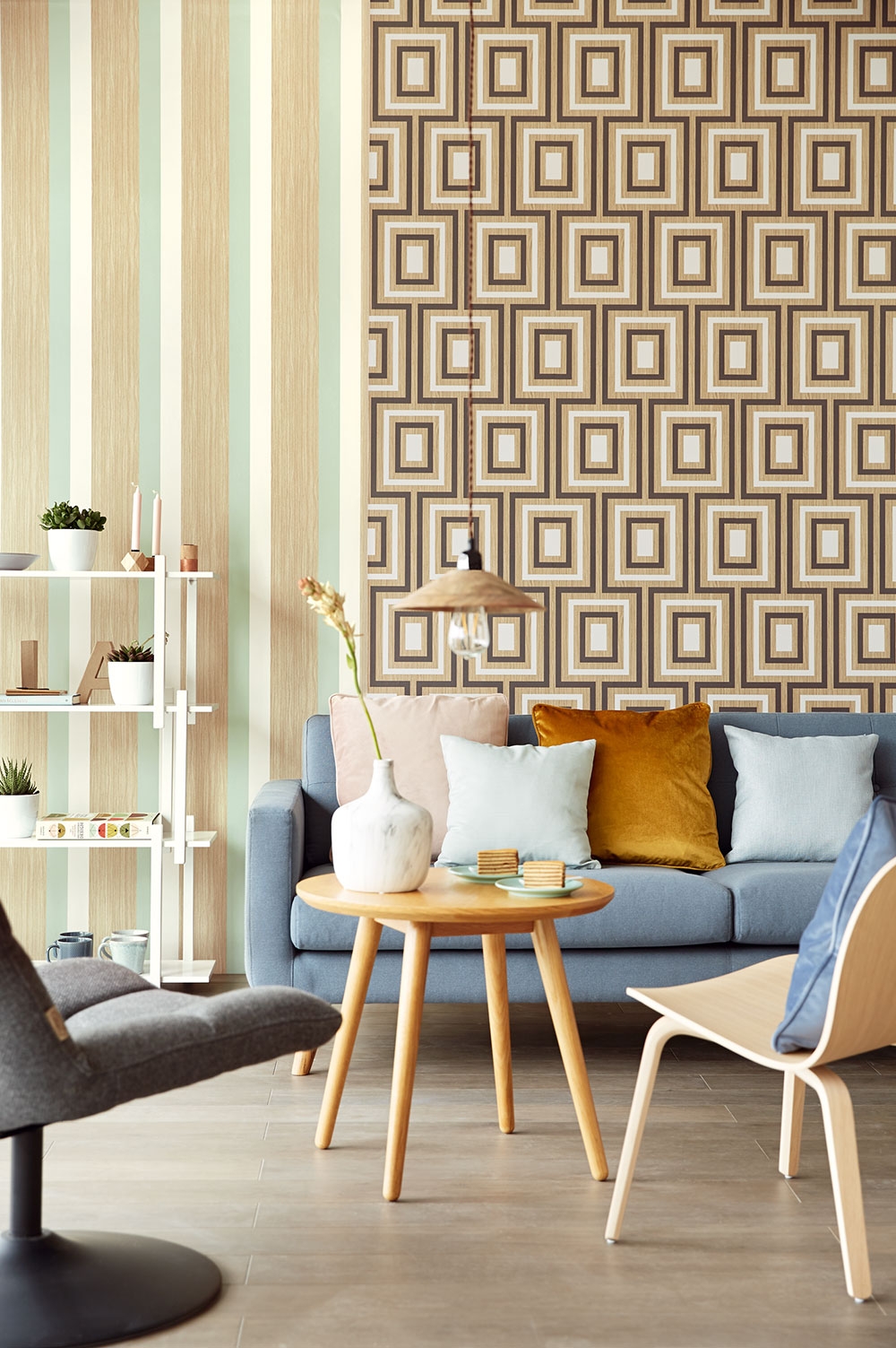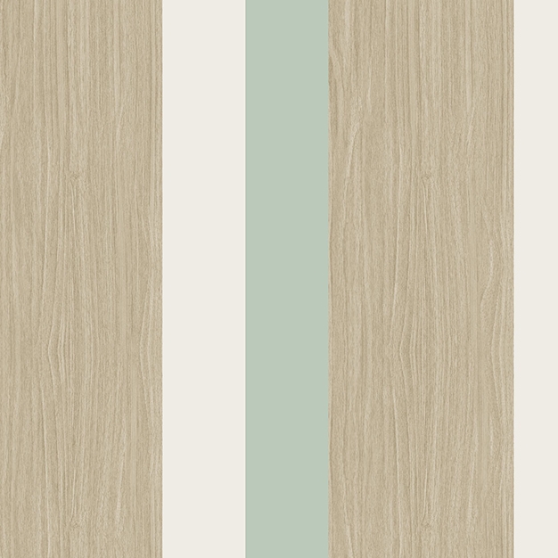 Bílé, tyrkysové a žíhané šedo-hnědé pruhy ( struktura dřeva )na vliesové tapetě na zeď.