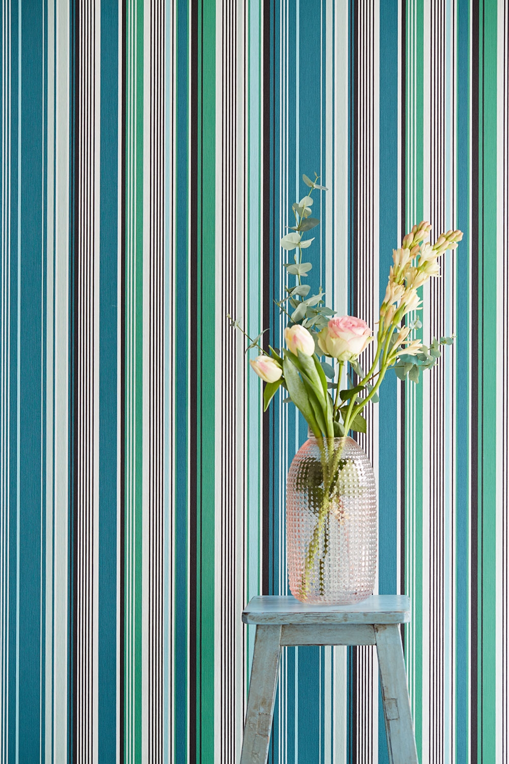 Proužky v modré, zelené a tyrkysové barvě na vliesové tapetě na zeď.