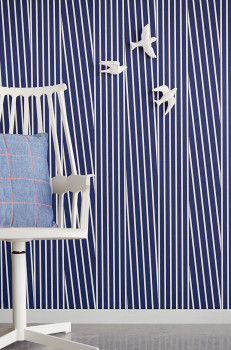 Současné trendy nadčasovým pruhům a proužkům přejí. Jsou kombinovatelné se vzorovými i jednobarevnými tapetami, nebo samostatně dokáží vymezit a zútulnit prostor. Netradiční modro-bílá proužkovaná vliesová tapeta.