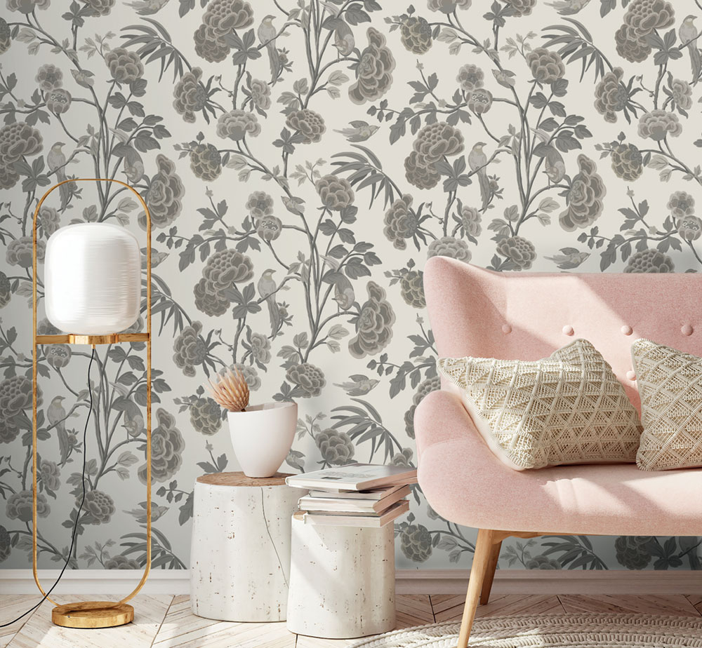 Elegantní vliesová tapeta s přírodním motivem květů a ptáků.