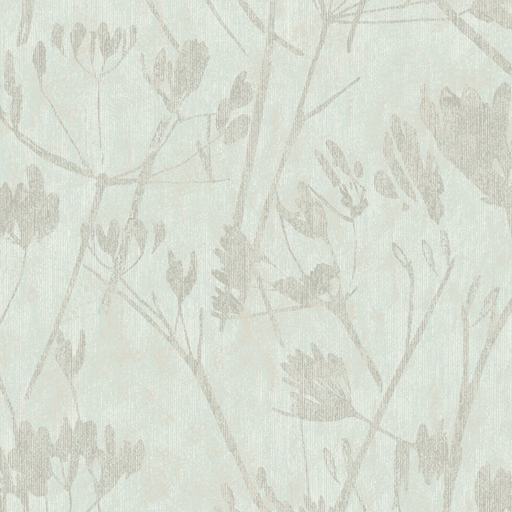 Šedo-zelené rostlinné motivy na matné zelené vliesové tapetě na zeď s jemnými zlatými odlesky.