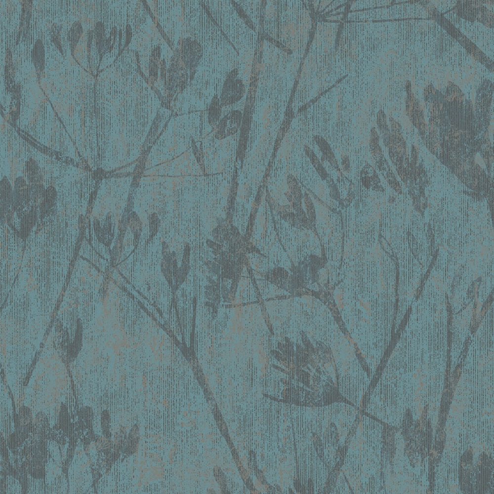 Modré rostlinné motivy na matné modro-zelené vliesové tapetě na zeď.