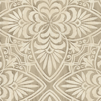 Béžový ornamentální vzor na šedo-hnědé strukturované vliesové tapetě na zeď.