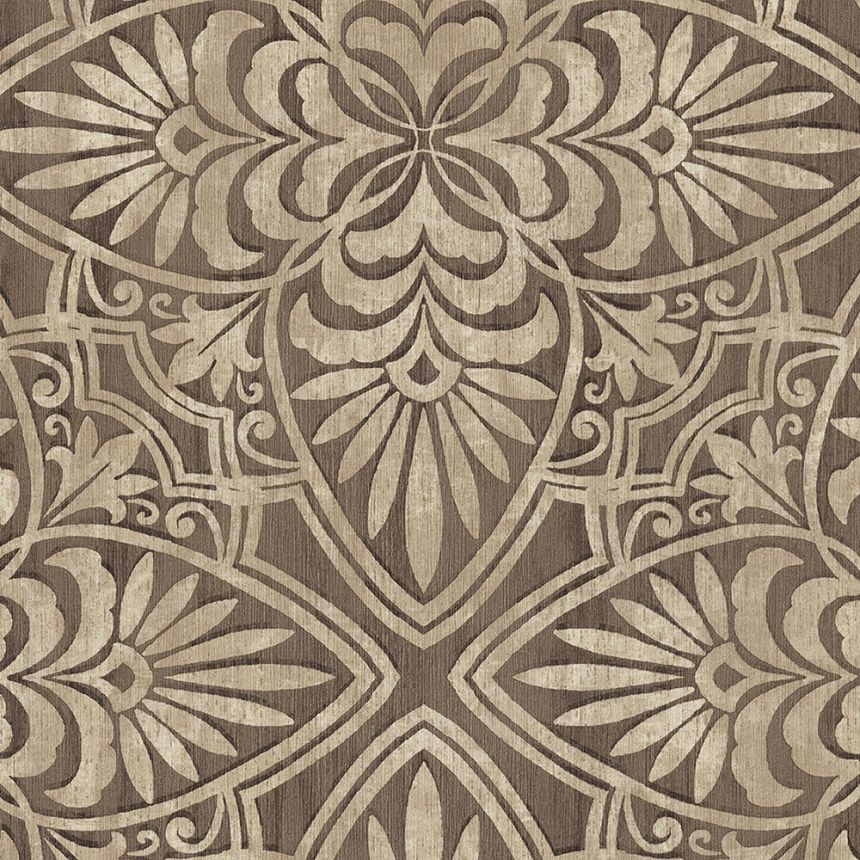 Krémovo-béžový ornamentální vzor na hnědé strukturované vliesové tapetě na zeď.