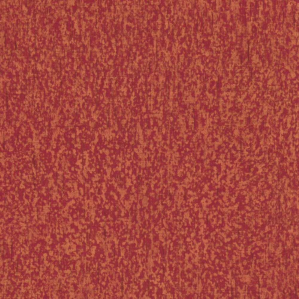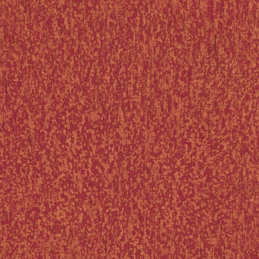 Kropenatý červený a oranžově-zlatý vzorek na vliesové tapetě s látkovou strukturou.