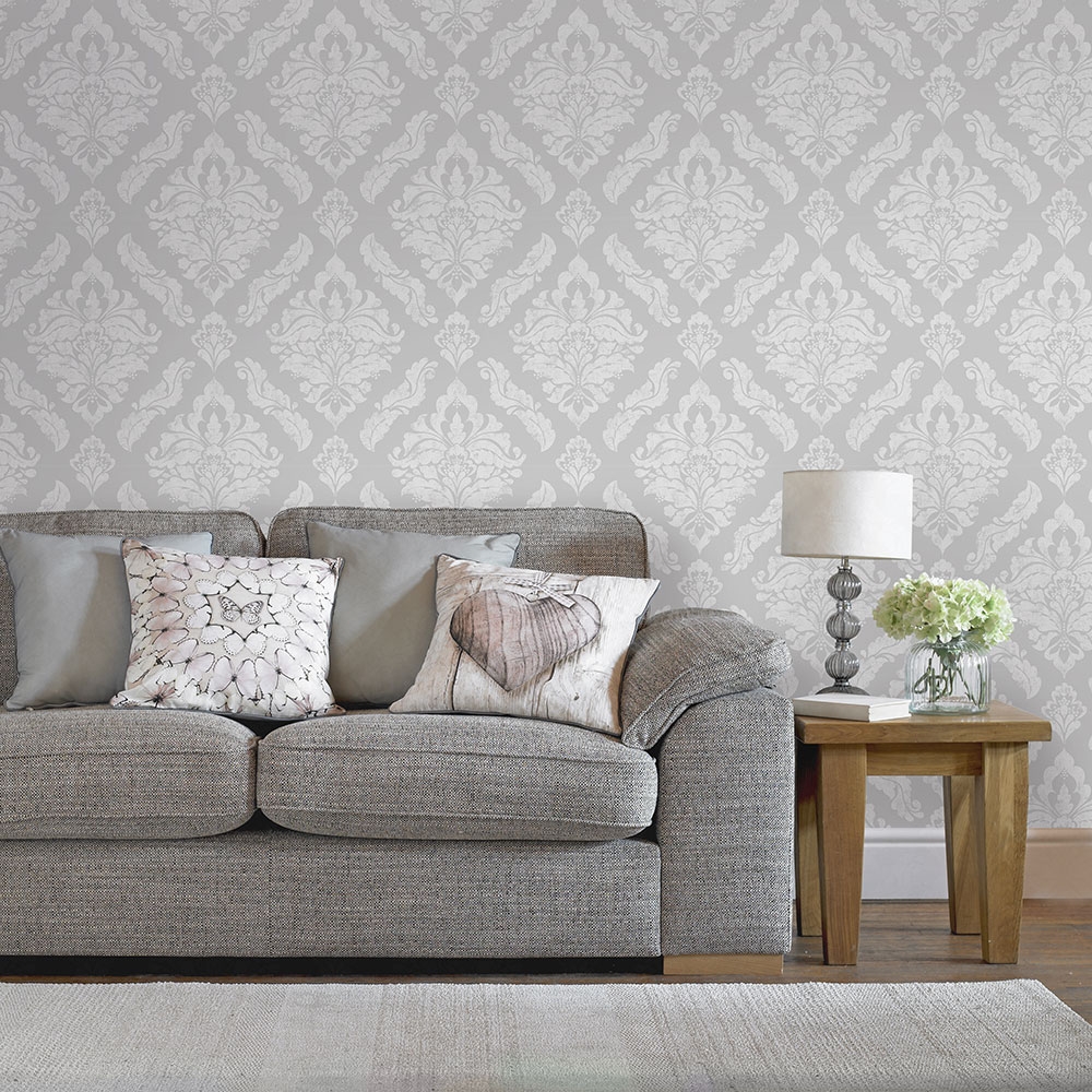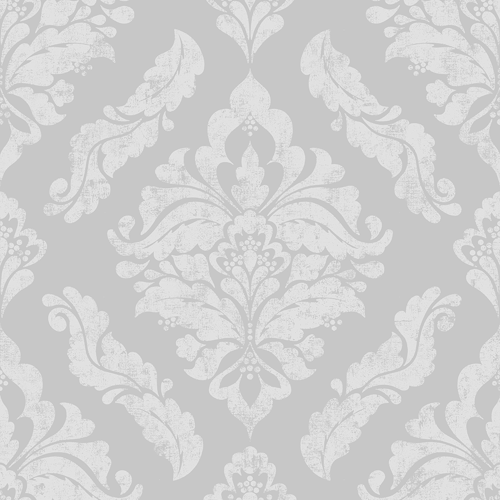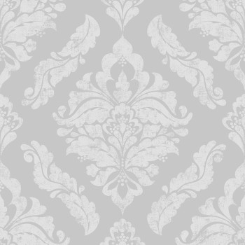 Dodejte vašemu interiéru eleganci a styl. Výrazný stříbrný damaškový vzor s patinou na šedé vliesové tapetě na teď.