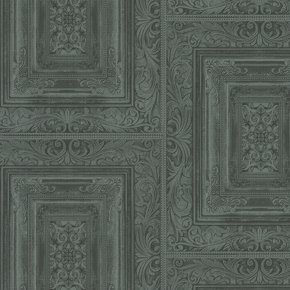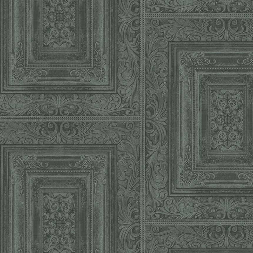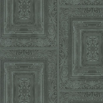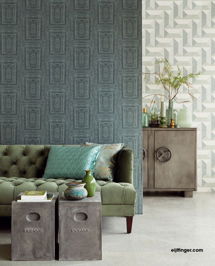 Efekt vyřezávaného obložení v zeleno-modrých odstínech s efektem lesku a matu na vliesové tapetě na zeď.