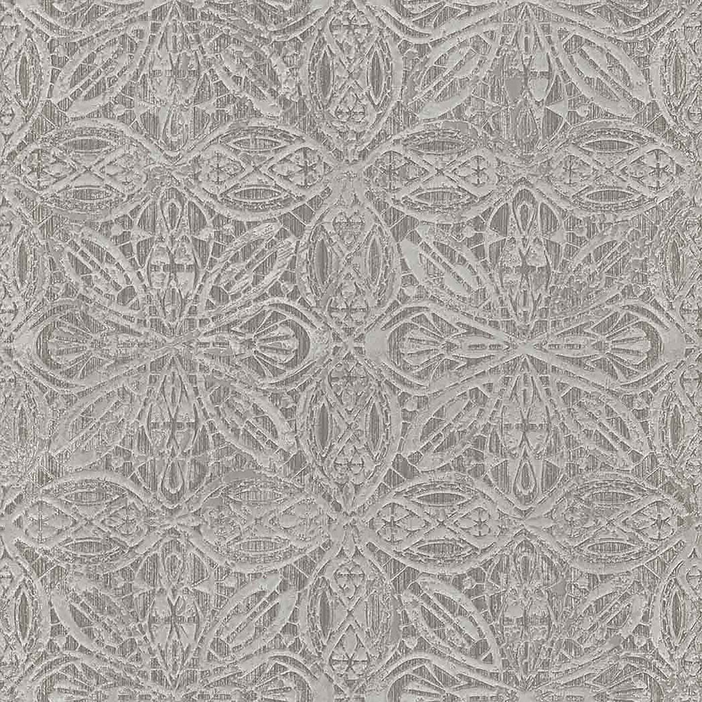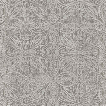 S metalickými odlesky a výraznými texturami vnesete do vašeho interiéru luxus a styl. Plastický ornamentální zámecký vzor v odstínech šedé, podklad stříbrný. Snadno nakombinujete se souvisejícími vzory.