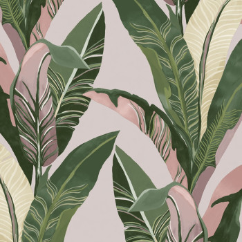 Rostlinné motivy představují moderní trend v oblasti bydlení. Velké listy v zelených, růžových a okrových odstínech na růžové vliesové taoetě na zeď.