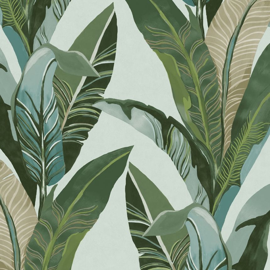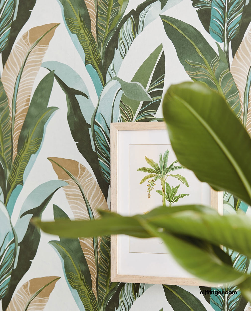 Rostlinné motivy představují moderní trend v oblasti bydlení. Velké listy v zelených, hnědých a tyrkysových odstínech nasvětle modré vliesové tapetě na zeď.