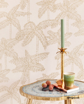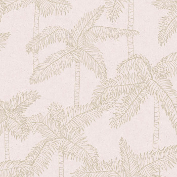 Rostlinné motivy představují moderní trend v oblasti bydlení. Zlaté obrysy palem na růžové jemně žíhané vliesové tapetě na zeď.