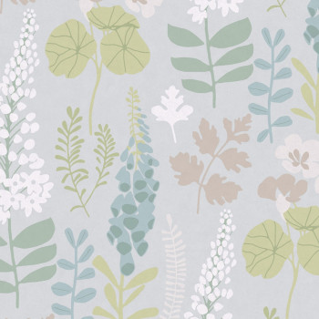 Rostlinné motivy představují moderní trend v oblasti bydlení. Listy a květiny v krémových, béžových, modrých a zelených odstínech na světle tyrkysové vliesové tapetě na zeď.