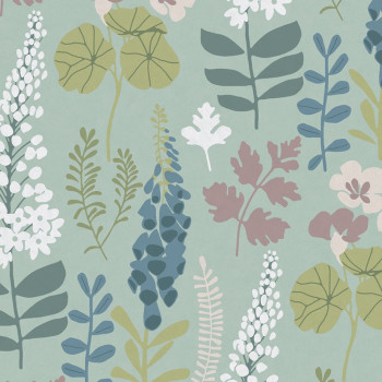 Rostlinné motivy představují moderní trend v oblasti bydlení. Listy a květiny v růžových, modrých a zelených odstínech na tyrkysové vliesové tapetě na zeď.