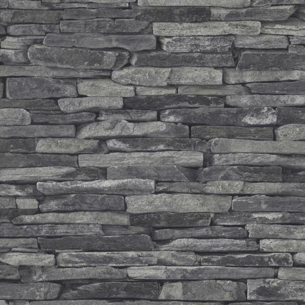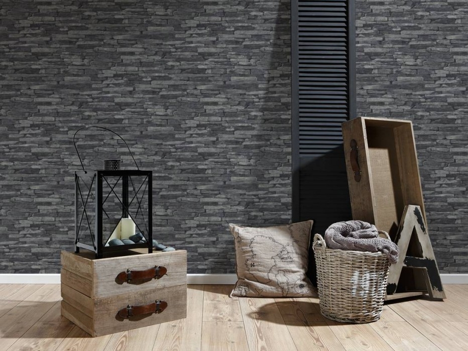 Kámen zdokonalí celkový design vašeho interiéru a vytvoří velmi příjemnou atmosféru. Tapeta imituje stěnu z šedo-černých břidlicových plátů.