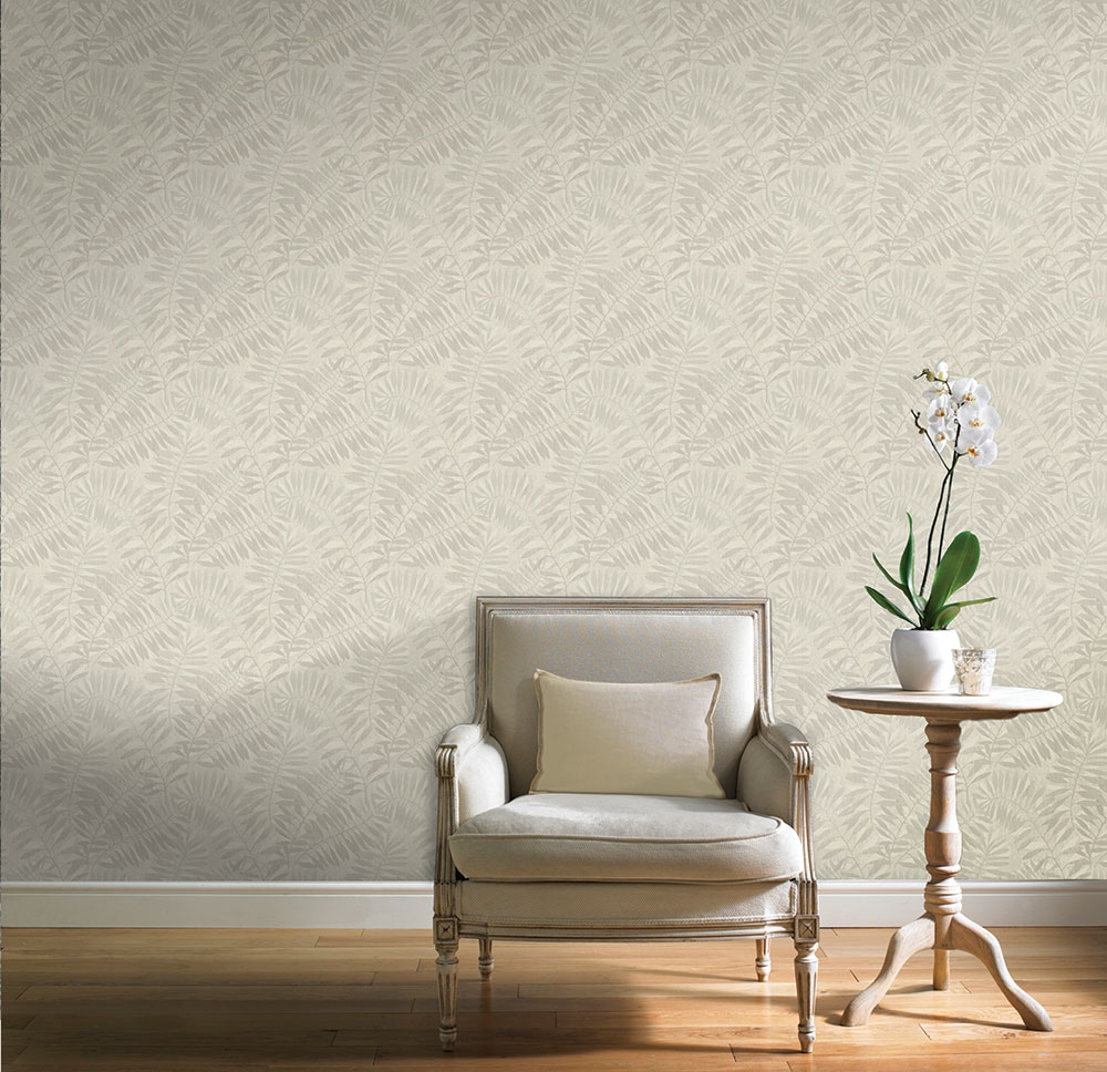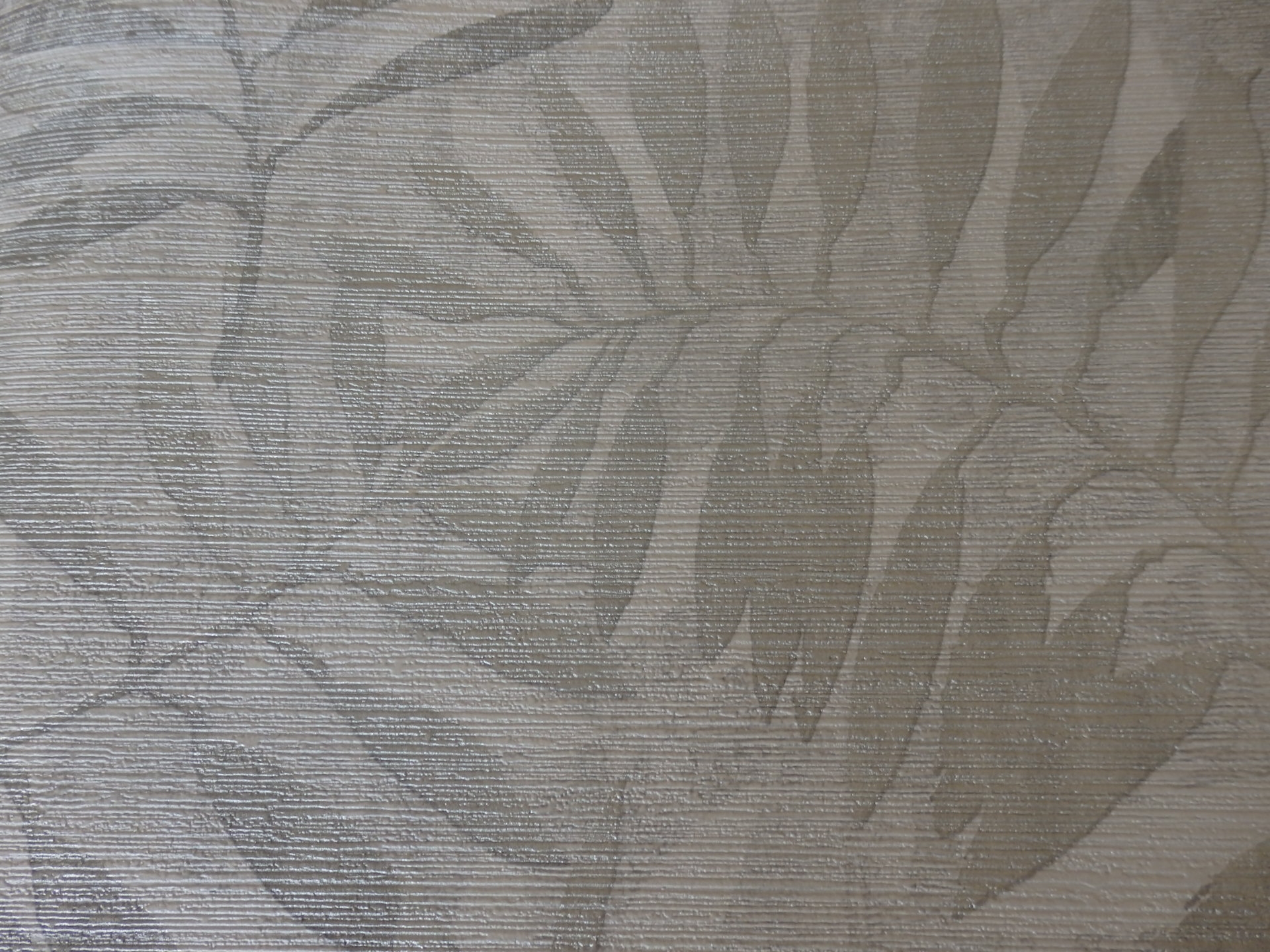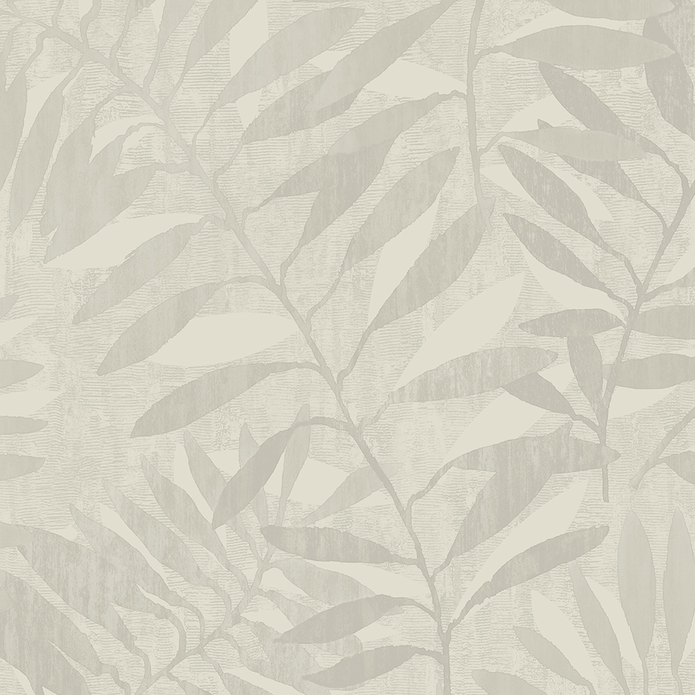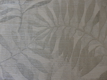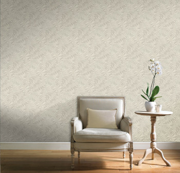 Rostlinné motivy zútulní a zpříjemní každý interiér. Stříbrné listy na pololesklém šedo-béžovém podkladu. Vodorovně žíhaná struktura.