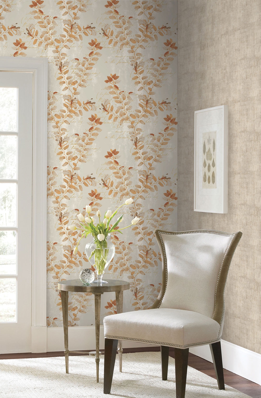 Přírodní a rostlinné motivy zpříjemní a zútulní každý interier. Design větviček v šedých a hnědých odstínech se stříbrnými metalickými detaily, podklad šedý, pololesklý, mramorovaný, krémové nápisy.