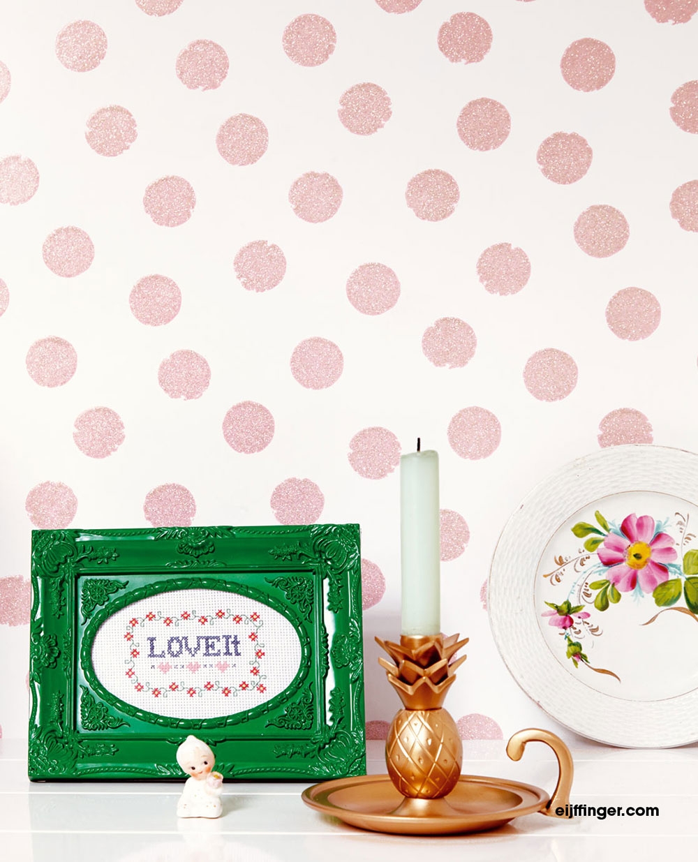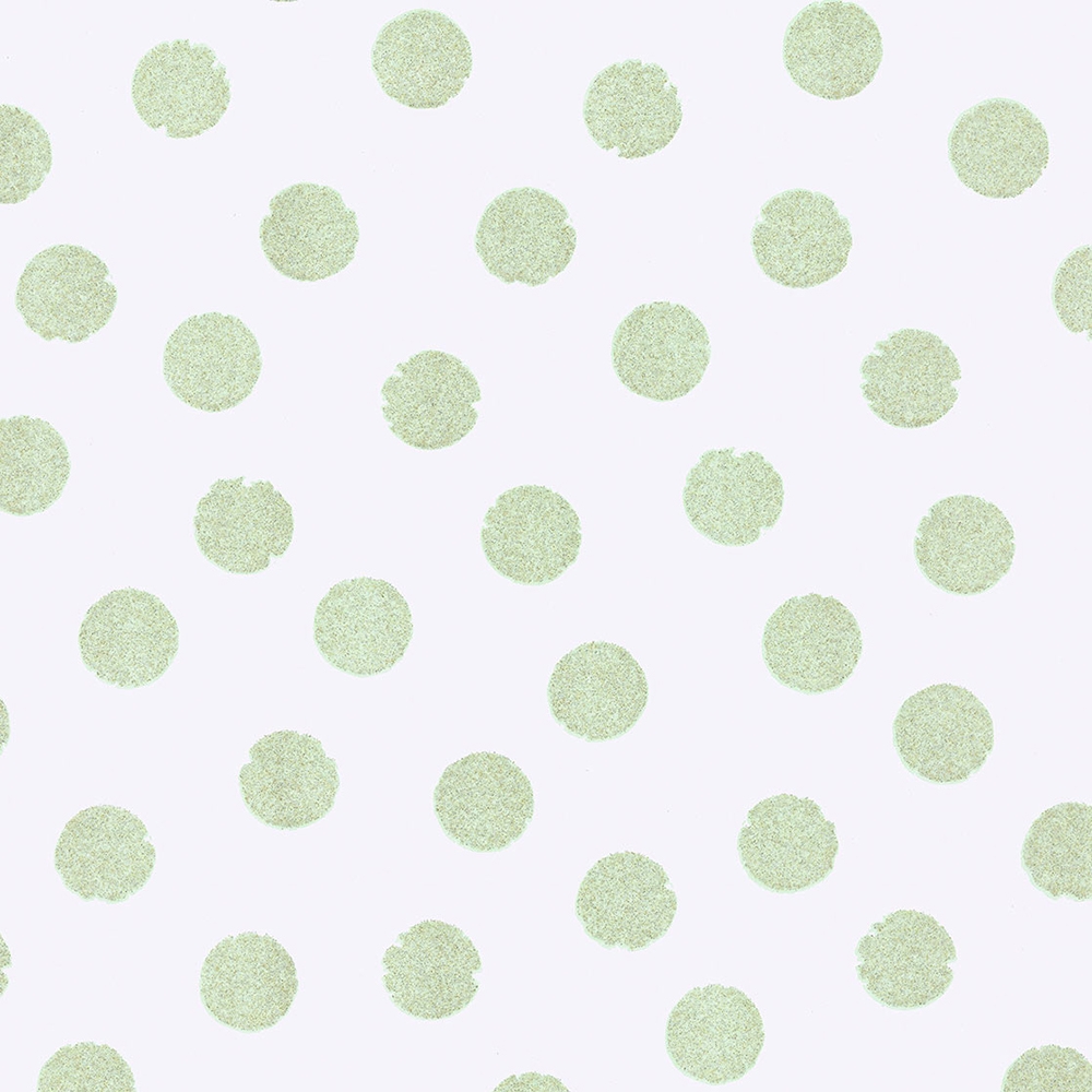 Puntík vnese do vašeho interieru nový rozměr a originalitu. Zelené puntíky se stříbrnými třpytkami na bílém podkladu.