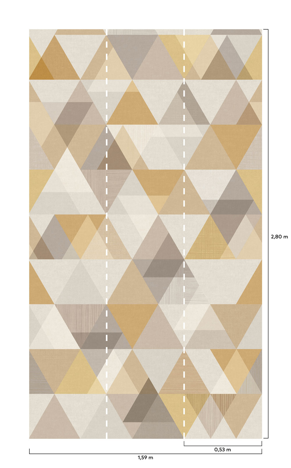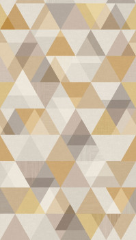 Výrazný geometrický vzor v odstínech okrové, šedo-zelené a hnědo-béžové. Vlies. Tapeta má navazující vzor, pro větší šířku stačí přikoupit další kus.
