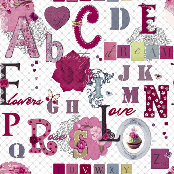 Scrabble - romantický kolážový design, vhodný do dívčího pokoje. Podklad jemný metalický vzorek. Kombinujte se souvisejícími vzory.