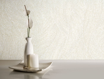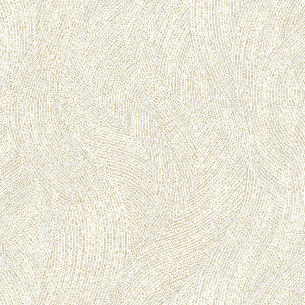 Vliesová tapeta - elegantní proužková textura tvořící vlny v odstínech krémové a pololesklé zlaté. Odstíny a odlesky se mění podle dopadu světla. Podklad tapety je vlies, povrch vinyl.