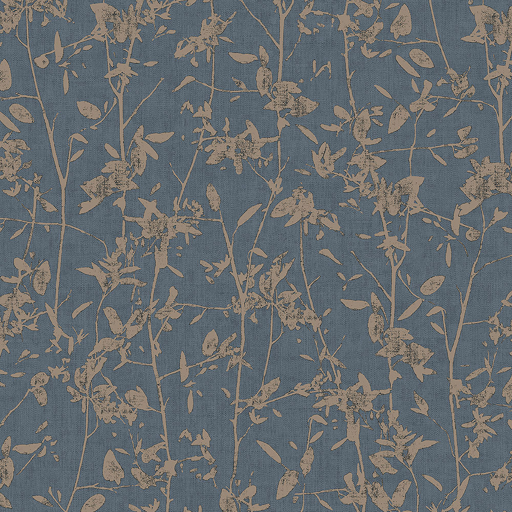 Modrá vliesová tapeta na zeď se zlatými stonky s lístky.