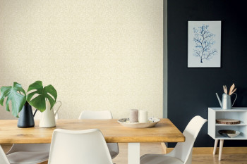 Šíře role 1m. Vliesové tapety s vinylovým povrchem, inspirované přírodou. Jemně plastická textura, odlišné struktury naznačující geometrické linie, odstíny na tapetě krémové s jemným zlatavým pololeskem. Odlesky se mění podle dopadu světla na tapetu.