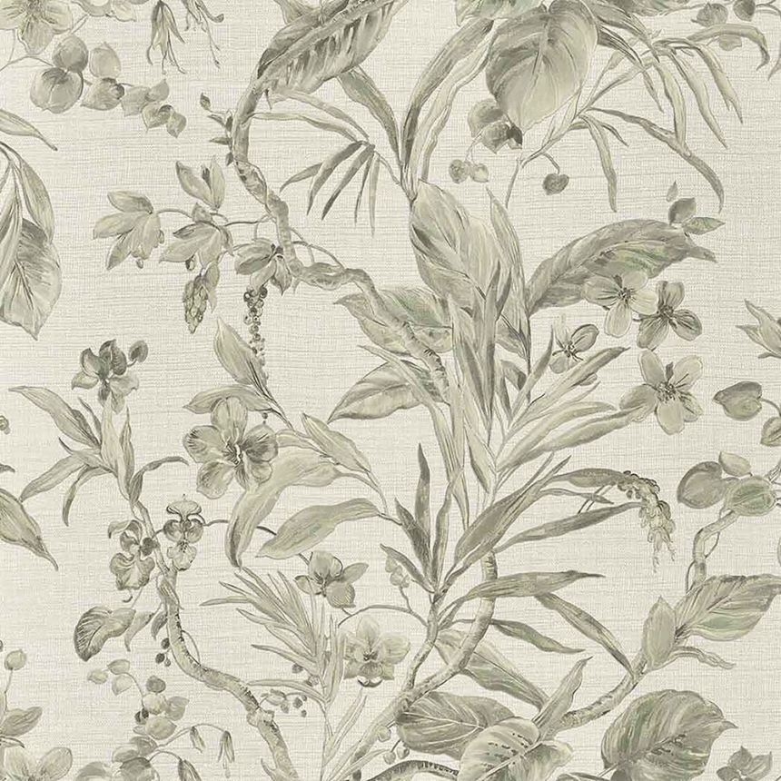 Šíře role 0,7m. Design květin, orchidejí a listů - Luxusní vliesová tapeta s vinylovým povrchem, podkladem je výrazně plastická textilní struktura v krémové barvě s jemným metalickým leskem, design větviček, listů, orchideí - odstíny jemně metalické zelené. Barvy a lesky se mění podle dopadu světla. Snadno zkombinujete se souvisejícími vzory.