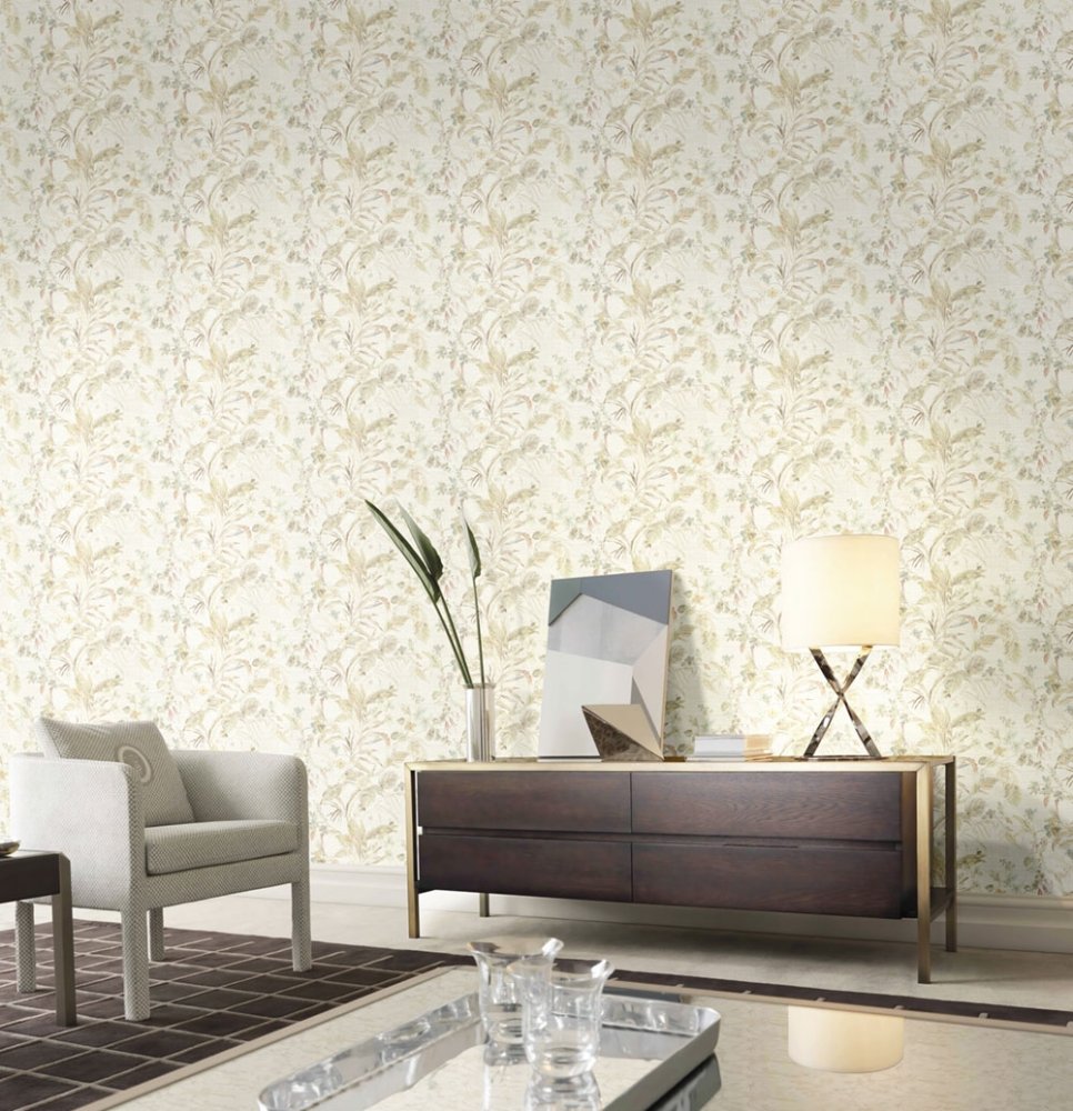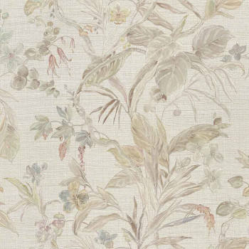 Šíře role 0,7m. Design květin, orchidejí a listů - Luxusní vliesová tapeta s vinylovým povrchem, podkladem je výrazně plastická textilní struktura v krémovém odstínu s jemným perlovým leskem, design větviček, listů, orchideí. Barvy a lesky se mění podle dopadu světla. Snadno zkombinujete se souvisejícími vzory.