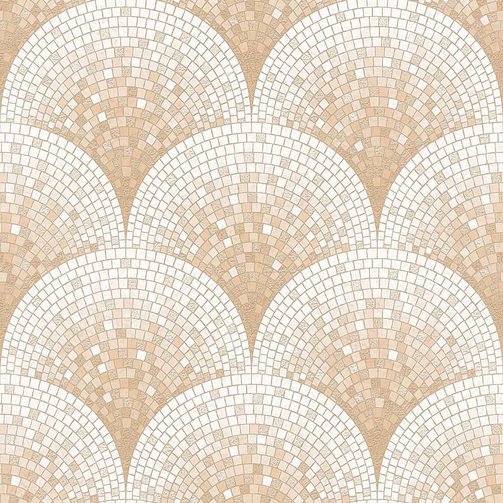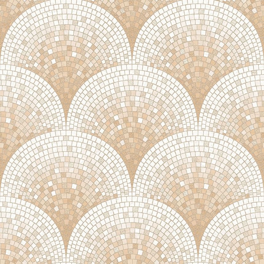 Vliesová tapeta na stěnu. Plastický mozaikový design v odstínech bílé, béžové a hnědé s perleťovými odlesky.