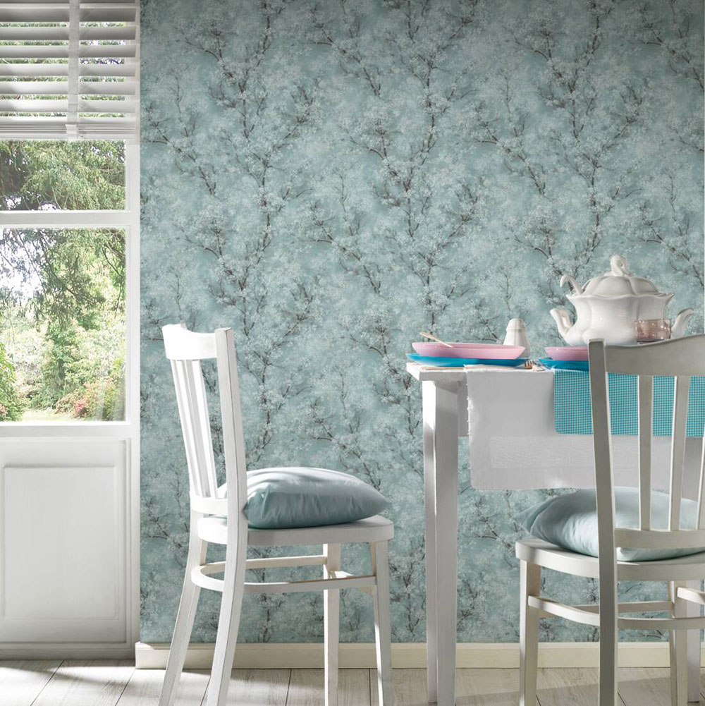 Design rozkvetlého stromu, drobné třpytky. Vliesové tapety se snadno lepí, snadno strhávají.