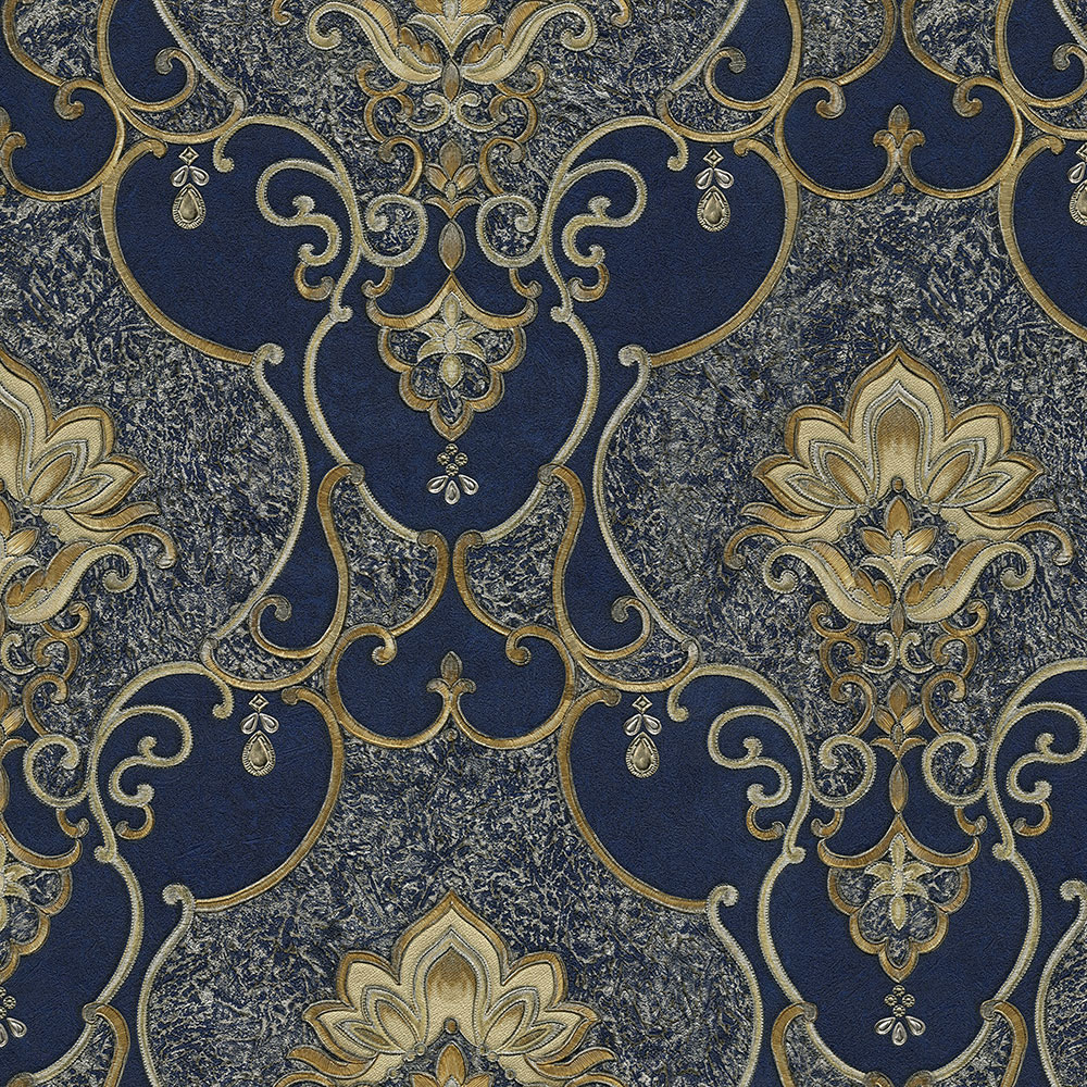 Luxusní modrá vliesová tapeta na zeď s bohatým plastickým ornamentálním zlatým vzorem. Šíře role 1,06 m.