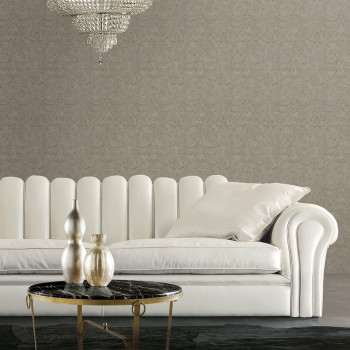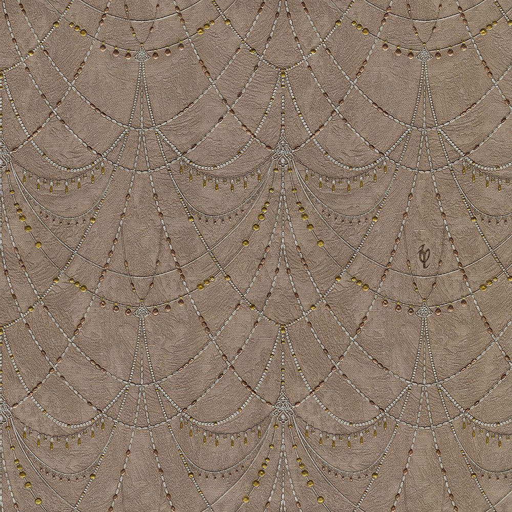 Luxusní vliesová tapeta na zeď se vzorem metalických korálků na hnědém štukovém podkladu. Šíře role 1,06 m.