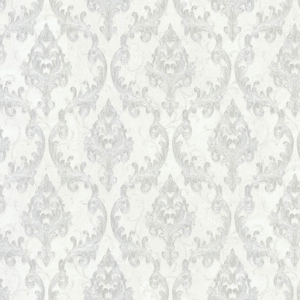 Šíře role 1,06 m. Luxusní vliesové tapety s vinylovým povrchem inspirované krásou italských historických paláců - damaškový vzor, plastická textura v odstínech perlové / bílá s metalickým leskem, vzor s drobnými stříbrými třpytkami. Snadno zkombinujete se souvisejícími tapetami.