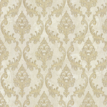 Šíře role 1,06 m. Luxusní vliesové tapety s vinylovým povrchem inspirované krásou italských historických paláců - damaškový vzor, plastická textura v odstínech metalické krémové, vzor béžový se zlatými třpytkami. Snadno zkombinujete se souvisejícími tapetami.