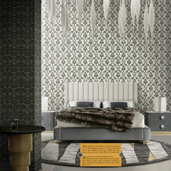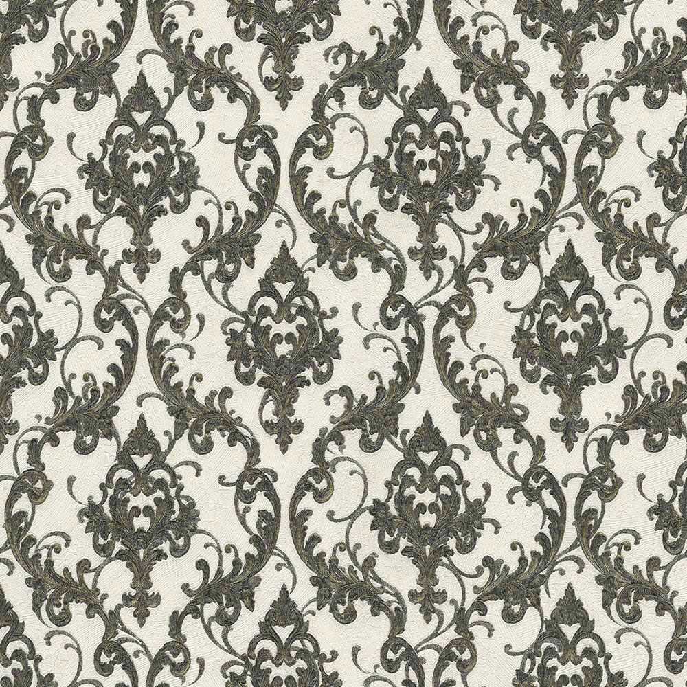 Šíře role 1,06 m. Luxusní vliesové tapety s vinylovým povrchem inspirované krásou italských historických paláců - damaškový vzor, plastická textura v odstínech perlové, vzor černá, stříbrná, zlatá, drobné zlaté třpytky. Snadno zkombinujete se souvisejícími tapetami.